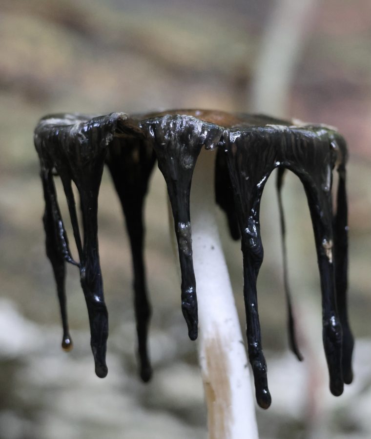 The Common Inkcap (Coprinopsis atramentaria) is poisonous and as it decomposes, its cap melts into a sticky black substance. This black mess used to be used as ink after boiling with a little water and cloves, or urine.